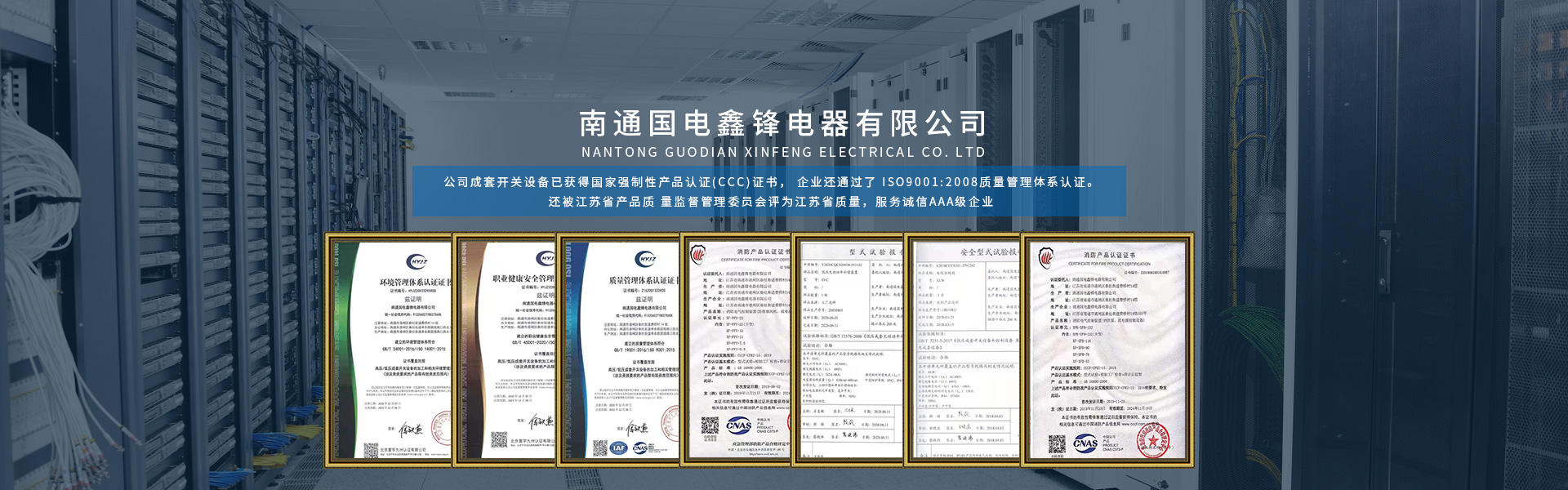 南通國(guó)電鑫鋒電器有限公司座落在有中國(guó)江蘇省南通市,南通是全國(guó)首批十四個(gè)沿海對(duì)外開(kāi)放城市之一,是我國(guó) 民族紡織工業(yè)的搖籃和長(zhǎng)江沿線的港口城市,又是中國(guó)的體育之鄉(xiāng), 教育之鄉(xiāng)崛起中的南通是江海大地上一顆璀燦的明珠。 公司成立于2005年,是專(zhuān)業(yè)生產(chǎn)各類(lèi)高低壓成套開(kāi)關(guān)設(shè)備的專(zhuān)業(yè)廠家,公司成套開(kāi)關(guān)設(shè)備已獲得國(guó)家強(qiáng)制性產(chǎn)品認(rèn)證(CCC)證書(shū), 企業(yè)還通過(guò)了 ISO9001:2008質(zhì)量管理體系認(rèn)證。